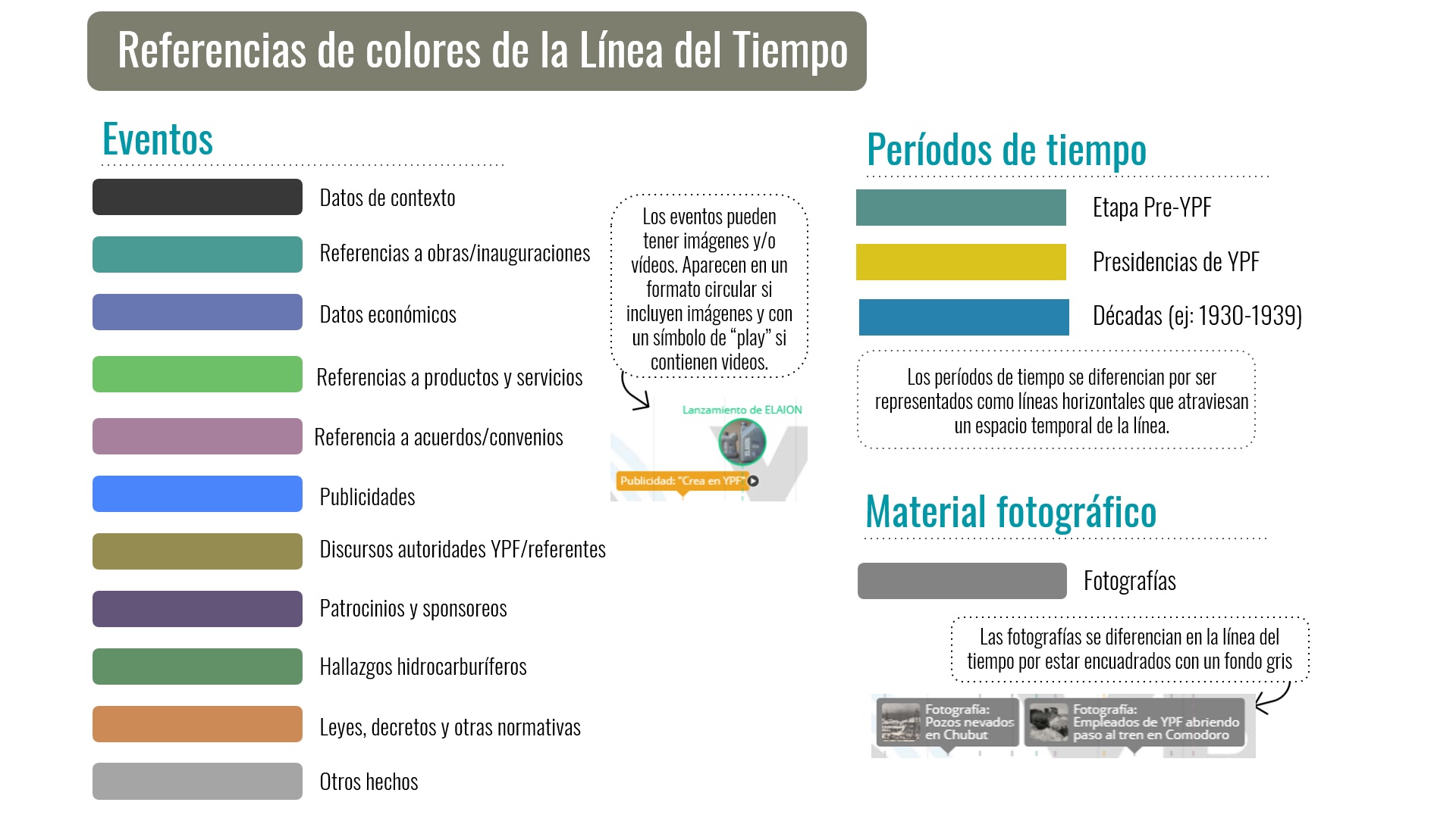 En la sección de Referencias se encuentran disponibles para su consulta las referencias de colores que se han utilizado para representar cada tipo de evento y una breve explicación de cómo se visualizan los mismos en la línea del tiempo.